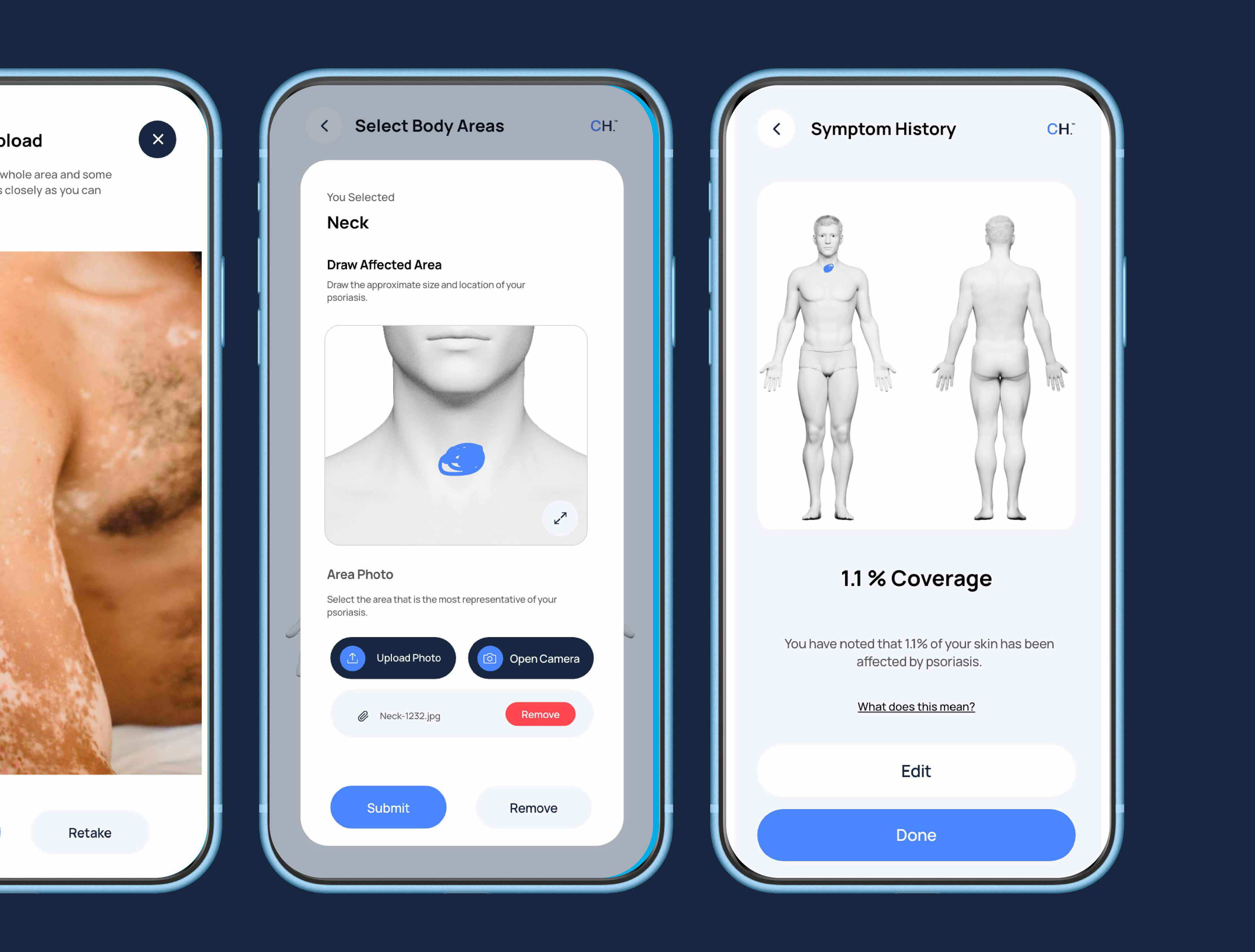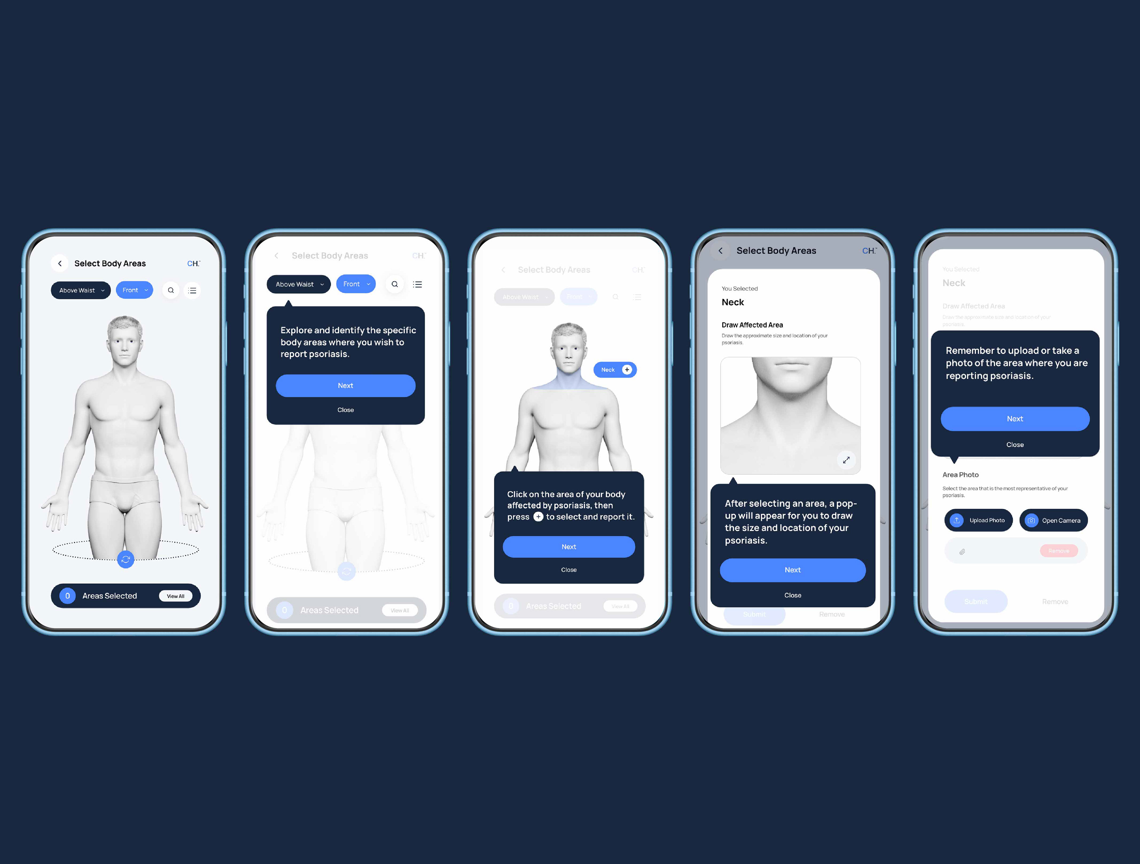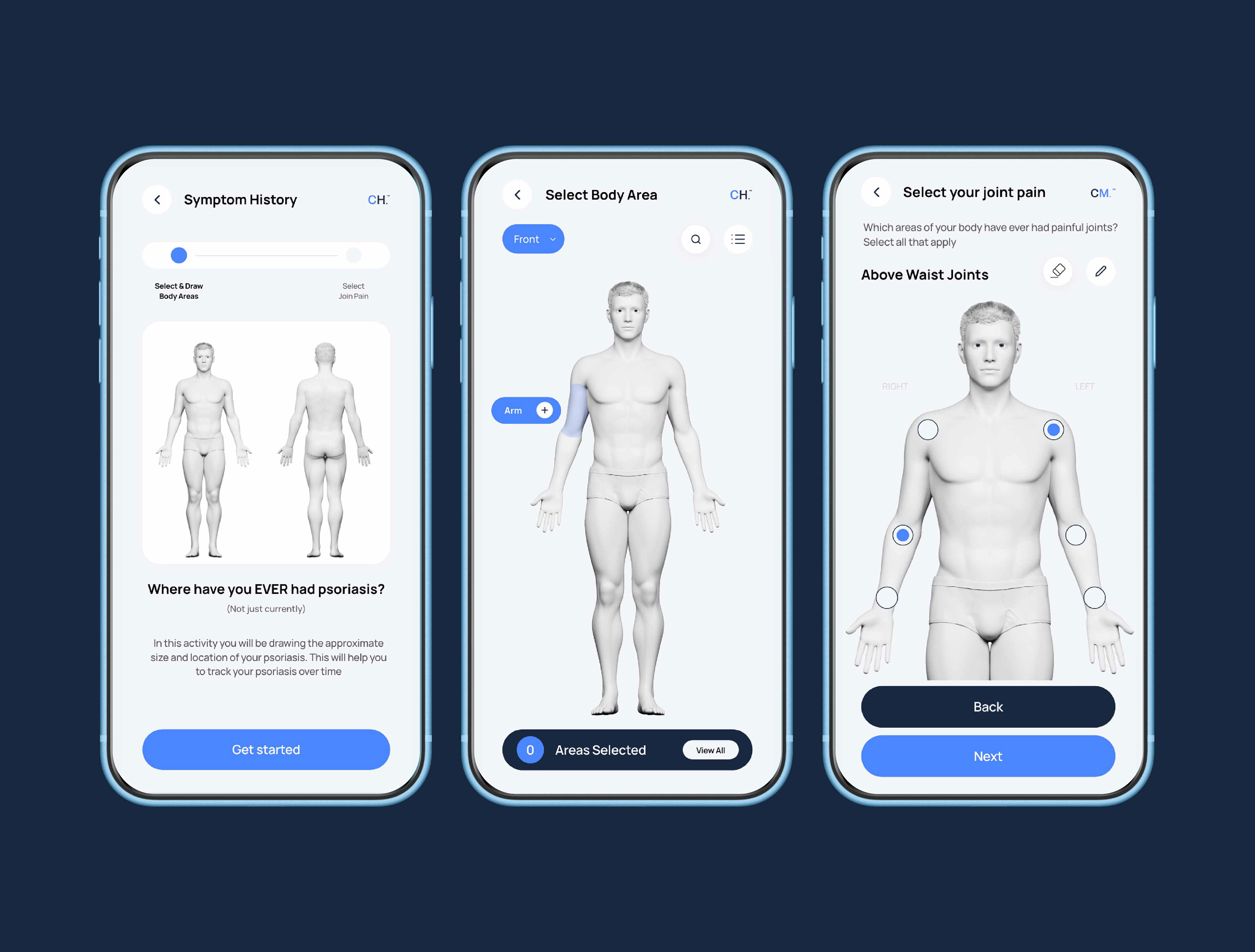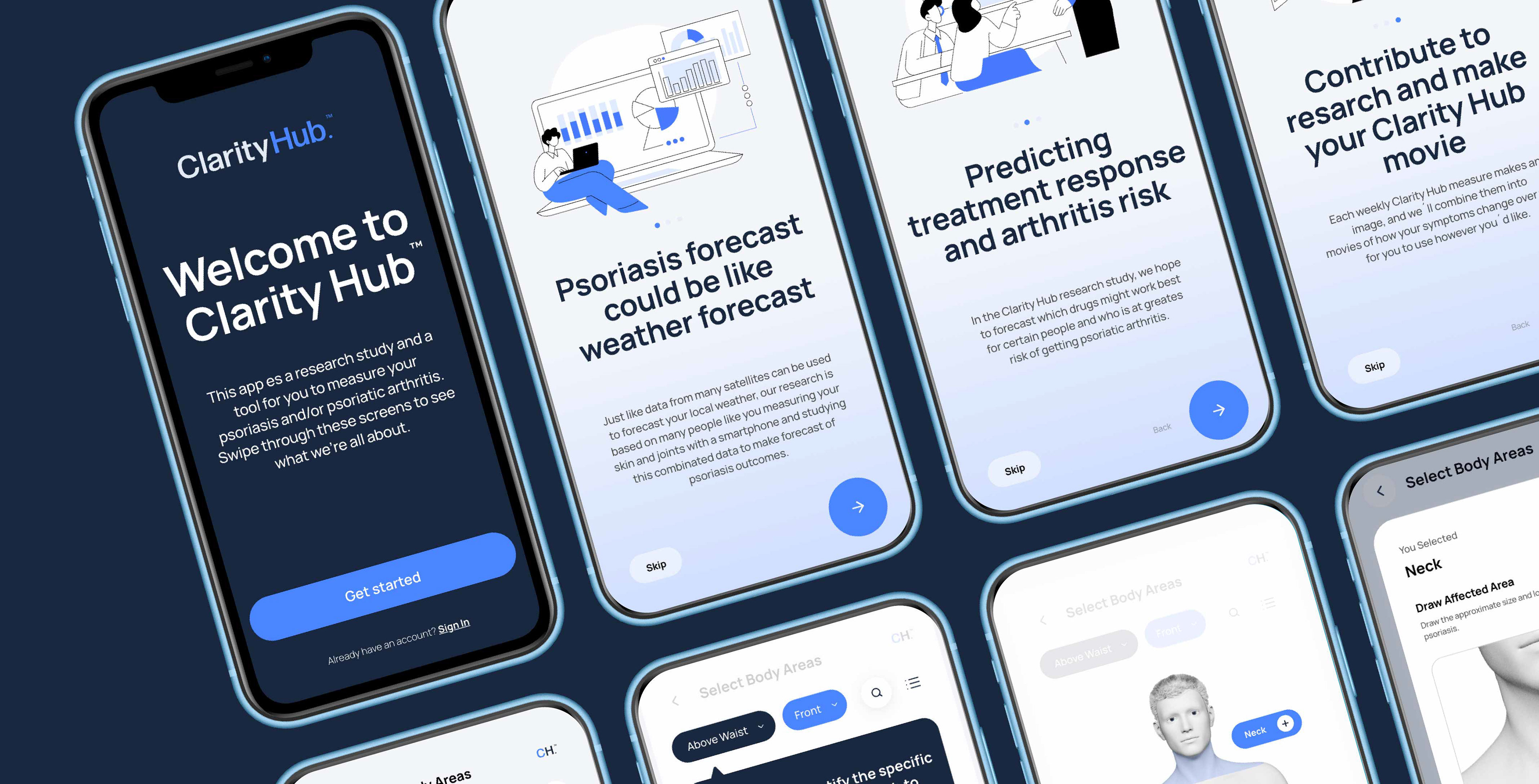 We created an advanced health app designed to help users monitor psoriasis and psoriatic arthritis, predict treatment response, and assess arthritic risk. The experience enables patients to report symptoms, visualize affected areas, and track progress over time.